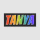 This fun, vibrant, multicolored name tag design features the common first name "TANYA", with the letters of the name having a colourful rainbow spectrum like gradient colouring pattern, on a black coloured background. A nametag like this might be worn by an employee, a staff member, or a volunteer named Tanya, to help identify the wearer to others. [~Z0000344]