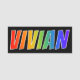 This fun, vibrant, multicolored name tag design features the common first name "VIVIAN", with the letters of the name having a colourful rainbow spectrum like gradient colouring pattern, on a black coloured background. A nametag like this might be worn by a customer service representative, a volunteer, or a staff member whose given name is Vivian, to help identify the wearer to others. [~Z0000344]
