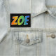 This fun, vibrant, multicolored name tag design features the common first name "ZOE", with the letters of the name having a colourful rainbow spectrum like gradient colouring pattern, on a black coloured background. A nametag like this might be worn by a staff member, a volunteer, or an employee whose first name is Zoe, to help identify the wearer to others. [~Z0000344]