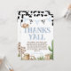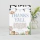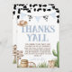 Cute First Rodeo thank you card featuring cowboy hat, cow print banner, cactus, boots, wagon wheel, barrel, and rustic western décor. Perfect for a cowboy-themed 1st birthday party. Personalize with your child’s name and message to thank guests for gifts and celebrating your little cowboy’s big day. Ideal for rodeo, farm, and country-style birthday parties. Printable or digital.