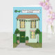 A simple illustration of a green house, decorated with shamrock shaped balloons and bunting. here is a plane flying over the house which has a banner behind it. The banner says 'Happy first S. Patrick's Day as a Family'.