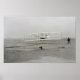 First successful flight of the Wright Flyer, by the Wright brothers. The machine travelled 120 ft (36.6 m) in 12 seconds at 10:35 a.m. at Kitty Hawk, North Carolina. Orville Wright was at the controls of the machine, lying prone on the lower wing with his hips in the cradle which operated the wing-warping mechanism. Wilbur Wright ran alongside to balance the machine, and just released his hold on the forward upright of the right wing in the photo. The starting rail, the wing-rest, a coil box, and other items needed for flight preparation are visible behind the machine.