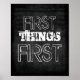 First things first quote poster has white shabby chic style text on distressed dark charcoal grey background wall art for decor in home or office.
