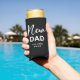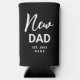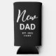Give a dad to be this First Time New Dad Established Personalized Seltzer Can Cooler as a gift. It has a modern typography design with "new dad" in chunky white script and block lettering followed by established year and name. Design is on both sides front and back of black can cooler.