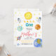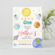 Adorable outer space themed first birthday invitation featuring a cute sun, planets, rocket, astronaut, and countdown design. Perfect for celebrating your little one’s first trip around the sun with a fun and colourful cosmic party theme.