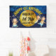 First trip around the sun 1st birthday party banner template with cute funny teddy bear in a space helmet and pants flying in space on celestial sky with golden sun at the background.