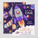 This 'first trip around the sun' boy's first birthday outer space themed invitation features a fun rocket blasting off into space surrounded by planets, comets, galaxies and a lot of stars on a dark purple background. On the back of the invitation is an astronaut floating in space, you can add a photo into the helmet of the space suit. All text in this design is editable, you can modify the design to suit any age. See the whole matching collection.