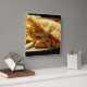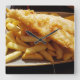 A close up photograph of Fish and Chips printed on a square wall clock.