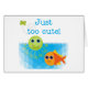 Colourful whimsical fun T-shirts, bodysuits, mugs, mousepads, and more featuring a gold fish and a green octopus in a sea of blue and text that reads "Just too cute!".