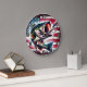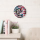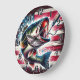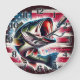 This wall clock is shown with a americana fish art print.