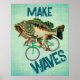 Largemouth bass fish riding a bicycle on a green poster that says "Make Waves"