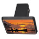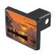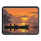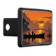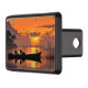 A trailer hitch cover featuring fisherman in a fishing boat at sunset. Warm sunset colours.