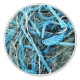 A colourful design of fishing net and bright blue rope from a boat and stored on the harbour jetty.