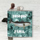 •Front-Realistic looking striped bass fish in the middle. Funny "Fishin' Fuel" text surrounding fish.