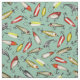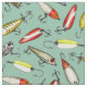 This fabric has fishing lure illustrations inspired by vintage fishing lures in shades of red and yellow on a pale teal background.