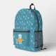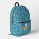 Fun kid blue backpack featuring a polar bear holding a fishing rod in one hand and a bucket full of fish in the other . The rest of the bag has a fishbone pattern . Personalize it with the child's initials .
