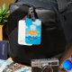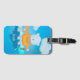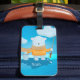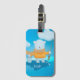 Cute blue kid luggage tag with cartoon polar bear holding a fishing rod and a bucket full of fish .