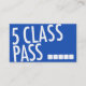 Fitness Class Business Card 5 Class Pass Card with a blue and white colour scheme and strong use of typography. Back of card has 5 punch or stamp placeholders. Perfect way to encourage class participation and an easy marketing tool. Use for a fitness company, gym, personal trainer gym, kettlebell training, bootcamp, or circuit training gym.