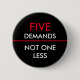 Over the past few months, the people of Hong Kong have been protesting against an extradition bill that the government refuses to withdraw. This bill means that anyone in Hong Kong, whether a citizen or tourist, can be extradited to mainland China for whatever reason they may have. China does not have a good track record when it comes to human rights, and the people of Hong Kong fear for their freedom and way of life. Recent protests have turned violent as protesters have been brutally beaten, shot at with rubber bullets, and exposed to tear gas and pepper spray. Everyday they are in the streets fighting for their country and their future. Bring attention to this matter and show your support by donning this "FIVE DEMANDS NOT ONE LESS" button. Don't let communist China win this fight.