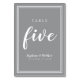 This design was created for smaller intimate wedding celebrations. Simple, minimalist and elegant Wedding Table Number FIVE design features a contemporary design with a double frame border in crisp white on a sophisticated grey background. The chic design provides timeless yet modern sophistication. Personalize wedding table design with your wedding details in crisp white lettering and script. The back of the card is a duplicate of the front. Order one for every table with the individual table numbers.