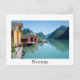 Carte postale d'un paysage avec des boathouses dans le village de Fjæ Rland (Mundal) et des montagnes avec réflexion dans l'eau du fjord Fjord Rpaysageæ, Sogn og Fjordane en Norvège avec une frontière et le texte : 'Norvège'.