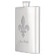 Ce flacon de prime comporte un grand argent fleur-De-lis porté sur l'avant. Personnalisez avec votre nom dans un manuscrit argenté débordant. Le Fleur-De-lys est un emblème ou un manteau des bras d'origine francophone. Le motif ici est argenté sur un arrière - plan argenté métallique mais la couleur d'arrière - plan peut être changée.