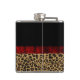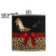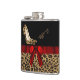 Flacon de femme chic fait en noir, sur le dessus, et un motif jaguar brun et noir tacheté, sur le fond, avec des graphiques d'un ruban satin rouge autour du milieu avec un joli arc rouge, sur le devant. Une paire de talons hauts en jaguar imprimé à la mode ornent le devant supérieur et le texte de couleur bronzée est prêt à être personnalisé pour vous-même ou comme une idée cadeau élégant à votre Fashionista préféré.