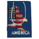 Bald eagle with an American flag design and patriotic America text on navy blue background.