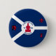 Round Button with flag of city of Fort Wayne, Indiana; blue and white flag and with red blockhouse in the centre and three illustrations in the blue field - illustration of Native American’s head, French fleur-de-lys and British lion