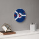 Clock with flag of city of Fort Wayne, Indiana; blue and white flag and with red blockhouse in the centre and three illustrations in the blue field - illustration of Native American’s head, French fleur-de-lys and British lion
