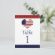 Beautiful USA flag heart patriotic or military themed party table number cards. These vibrant coloured patriotic table number cards are a wonderful addition to any patriotic themed party or military party. The text is in template form on this page ready for you to add your table numbers. The design features an American flag heart on a white background, in colours of red, white and blue on a white background. . The top and bottom of card are red and blue with white stars. A truly wonderful addition to your patriotic party tables! This design is a match to many of our patriotic and military themed invitations we sell in our store. For more styles and designs of patriotic or military cards, invites, stamps, and gift items, please visit our store!