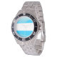 Has heft and feel of expensive stainless steel quartz watches. Good band with safety catch. I removed links, which is easy because engraved arrows show direction to push the linking pins. As always by this seller, the image (a railroad logo) is a perfect reproduction of my emailed image, and is precisely spaced and aligned.