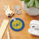 Button Keychain with flag of city of Atlanta, Georgia; blue flag with yellow seal with an illustration of phoenix rising from flames