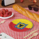 Paper plate with design with flag of Bogota, capital city of Colombia, red and yellow flag with coat of arms with eagle in the centre