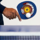Ping pong paddle with flag of city of El Paso, Texas; blue flag with seal of the city
