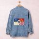 Denim Jacket with flag of city of Detroit, Michigan; red, white and blue flag with stars and stripes, fleur-de-lys, dragons and seal of the city