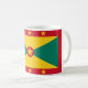 This design features the national flag of Grenada, which is a country in the West Indies in the Caribbean Sea at the southern end of the Grenadines island chain. Grenada consists of the island of Grenada itself, two smaller islands, Carriacou and Petite Martinique, and several small islands which lie to the north of the main island and are a part of the Grenadines. Grenada is situated to the northwest of Trinidad and Tobago, to the northeast of Venezuela and to the southwest of Saint Vincent and the Grenadines. Grenada is known as the "Island of Spice" because of its production of nutmeg and mace crops. An inhabitant of Grenada is known as a Grenadian. The capital of Grenada is St. George's, which is also the country's largest city. Other major cities in Grenada include Sauteurs, Gouyave, Grenville and Hillsborough.