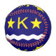 Baseball with design with flag of Kinshasa, capital city of Democratic Republic of Congo, blue flag with white wave, two golden stars and letter ‘K’ in the centre