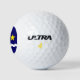 Golf balls with design design with flag of Kinshasa, capital city of Democratic Republic of Congo, blue flag with white wave, two golden stars and letter ‘K’ in the centre