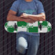 Skateboard with design with a flag of historic county of Kirkcudbrightshire, in Scotland, Great Britain; green and white flag with cross of Cuthbert