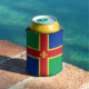 Can cooler with design with a flag of historic county of Lincolnshire, in England, Great Britain; green and blue flag with red and yellow cross and a Fleur-de-Lis in the centre