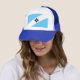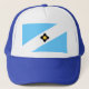 Hat with flag of city of Madison, Wisconsin; light blue and white flag with a black cross and yellow circle in the centre