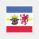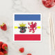 Paper napkin with variant flag of Mecklenburg-Western Pomerania; design with five horizontal stripes of red, white, blue and yellow, and with illustrations of bull’s head and red eagle