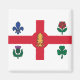 Magnet with the flag of Montreal, the most populous city in the province of Quebec, Canada. A white flag with a red cross, a white pine, a blue Fleur-de-lys, a red Rose of Lancaster, a shamrock, and a thistle