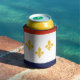 Can Cooler with flag of city of New Orleans, Louisiana; white flag with red and blue stripes and three golden fleur-de-lys