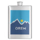 Flask with a design with the flag of Orem, Utah. A blue, white, and yellow flag with mountain peaks and the sun in the centre