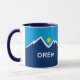 Mug with a design with the flag of Orem, Utah. A blue, white, and yellow flag with mountain peaks and the sun in the centre