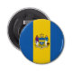 Button bottle opener with flag of city of Philadelphia, Pennsylvania; flag with three vertical bands of blue and yellow with city’s coat of arms in the centre