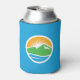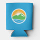 Can Cooler with a design with the flag of Provo, Utah. A blue flag with the Provo City logo in the centre. The logo represents the Utah lake and nearby mountain peaks with the rising sun in the background