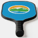 Pickleball Paddle with a design with the flag of Provo, Utah. A blue flag with the Provo City logo in the centre. The logo represents the Utah lake and nearby mountain peaks with the rising sun in the background